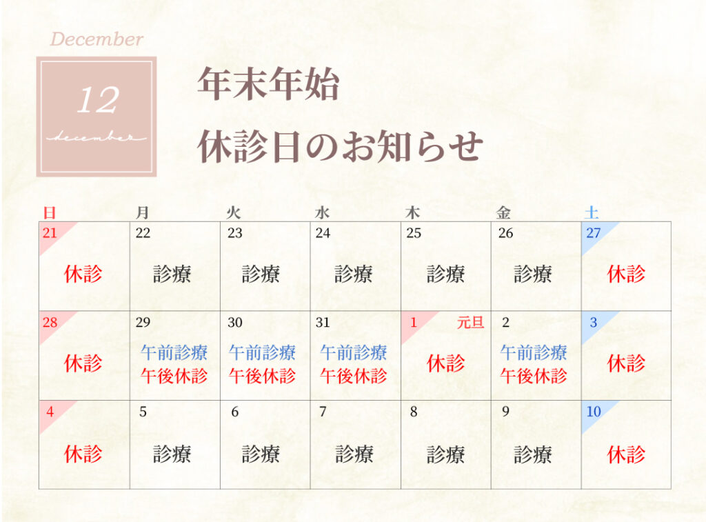 12/29(月)~12/31(水)、1/2(金)は9:00~12:00の午前のみ診療を行います。