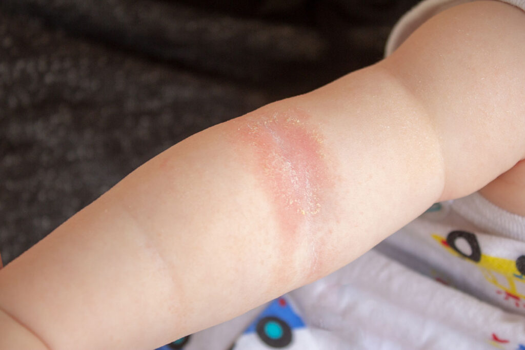 おでこやわき、ひじやひざの裏などにできやすく、赤いぶつぶつができかゆみを伴うことがあります。